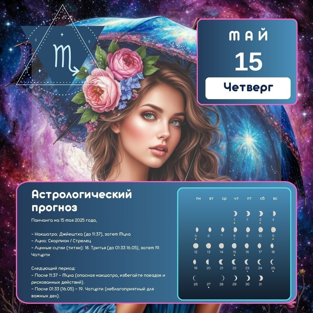 Астрологический прогноз на 15 мая: Глубины корней и крылья Стрельца Четверг под покровителем Юпитера — день мудрости и новых горизонтов. 🌌 Общая энергетика дня: Солнце, перешедшее в Телец, призывает к устойчивости и земной практичности. Но небо не даст застояться: Юпитер в Близнецах шепчет о любопытстве, а Луна с 11:38 в Стрельце разжигает огонь авантюризма. Хочется учиться, путешествовать, искать смыслы — и это нормально! Убывающая Луна ещё сильна, но её свет мягко подталкивает завершать циклы, а не начинать их. ✨ Благоприятные активности (Сиддха йога + Мула накшатра): - Копайте глубже! Исследуйте, анализируйте, изучайте тайны — от научных статей до собственного подсознания. - Зелёная магия: Сажайте растения, работайте с травами. Даже комнатный цветок, посаженный сегодня, принесёт особую силу. - Голос души: Пойте, выступайте, практикуйте мантры. Мула, связанная с корнями, поможет выразить то, что скрыто. - Тайны и трансформация: Займитесь астрологией, медитацией, размышляйте о цик