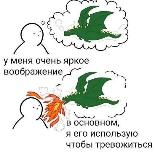 ТРЕВОЖНОСТЬ Воображение усилено развивали в детстве, чтобы проще было жить, быстрее понимать новую информацию, легче учиться И как сейчас мы его используем 😂 Стала реже делиться с вами разной пользой, воображение —все, я бесполезная, от меня все отвернутся, отпишутся... Через полчаса в голове картинка — стою одна в пустыне, оборванка со стаканом слез 👍🏻🙈(спасибо,дура) А ни че что тот факт, что я веду индивидуальную терапию, к каждой встрече я готовлюсь.... А ни че что сейчас сдаю сессию и много изучаю нового материала Плюс обычная жизнь, где нужно спать, готовить еду, общаться.... Привычка пнуть себя побольнее, чтобы лететь выше,дальше,дольше Давай воображение разворачивайся в другую сторону, где у меня все хорошо! Где мои клиенты получают профессиональную помощь, где я успешно сдала все экзамены, где есть я и яркая жизнь! Хочу вам напомнить, что знать себя —это здорово (да, порой неприятно и больно) Хотя бы для того, чтобы тормозить тревожку и разворачивать воображение на п