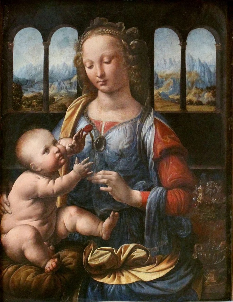 ☀️Характерные для Леонардо детали: заплетенные в косы волосы Мадонны, изящная левая рука, драпировка, цветок