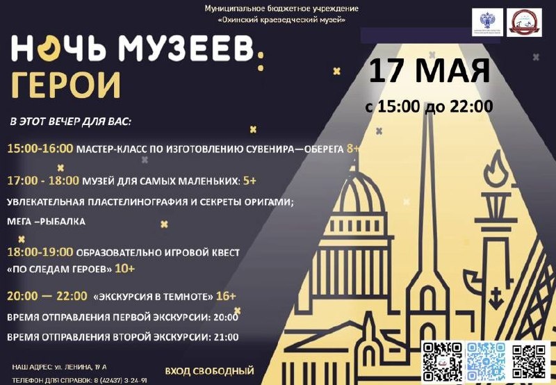 "Ночь музеев" в Охе: квест, мастер-классы и экскурсия в темноте! Охинский краеведческий музей примет участие в акции «Ночь музеев» на тему «Герои». В программе: мастер-класс по созданию оберегов, занятия по пластилину и оригами, игра «Мега-рыбалка», квест «По следам героев» и «Экскурсия в темноте». 🔵 Подпишись на ТВ «ОХА» | Прислать новость ✉️ Получи свой гонорар 🪙