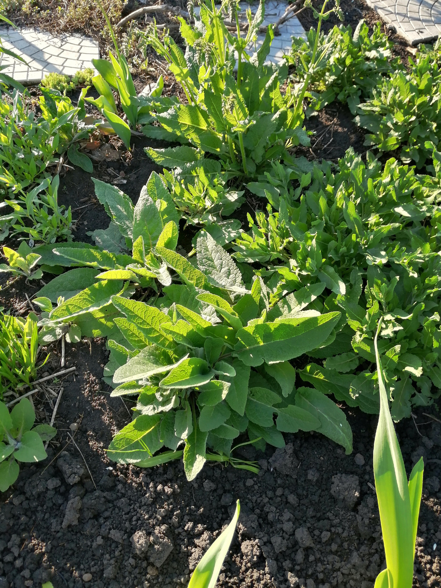 Не то чтобы он уже цвел, он только-только начал раскачиваться. Но хотя бы стало немного понятно, кого ждать, а кто, увы, погрызен намертво. Начнем с его "отростка", который получился случайно, уже по другую сторону винограда, и который сейчас в одной из частей я только формирую. Вот тут пока не могу сказать, кто - здесь должны быть синяк русский и коровяк Шэ Альбум. Как минимум один из них точно уцелел. А может случиться, что и оба. Все это дело обрамлено обычным шалфеем дубравным и монструозным шалфеем луговым. Последний уже на подходе - из моих шалфеев он самый ранний. Живы вкрапления наперстянки шерстистой, и это очень радует. Похоже, кентрантус перезимовал вообще весь. Нынче я его сеять не стала и, как выяснилось, не прогадала. Зимующий, он и выглядит великолепно - толстые устойчивые стебли, пышный куст, и зацветает очень рано. Как бы нынче это не случилось еще в мае, с нашей-то весной. Чуть на отшибе набирает цвет ясенец. То, чем меня пугали - агрессивный котовник сибирский