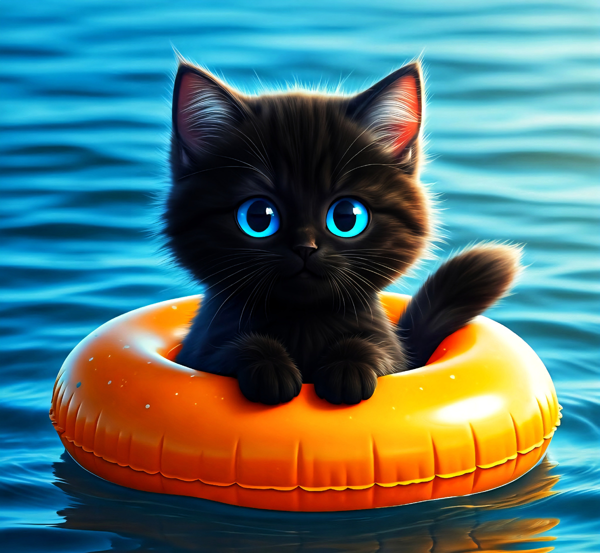 Вода, кстати, была такая же теплая, как в ванной. Малышу было немного страшновато, ведь его ванная намного меньше, чем это огромное море. Но папина рука и спасательный круг придавали ему уверенности. Когда круг котенка соприкоснулся с водой, он вдруг поднял его над водой, и малыш перестал чувствовать дно.
