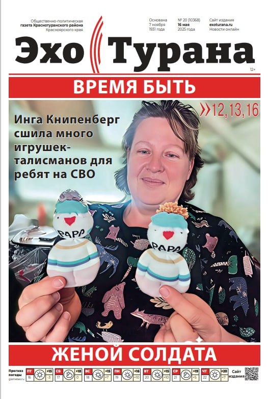 ВНИМАНИЕ! Уже завтра в продаже очередной номер газеты «Эхо Турана». Читайте в свежем выпуске: ДОСТУЧАТЬСЯ ДО «ФАВОРИТА» - о сложных отношениях между управляющей компанией и жителями многоквартирных домов в Краснотуранске. КАК ЭТО БЫЛО – фоторепортаж о том, как Краснотуранский район отметил 80-летний юбилей Победы в ВОВ. КРАСНОТУРАНСК: перспектива туризма – специалисты из Хакасии оценили возможности развития туризма в нашем районе. БОГ ЕДИН, А МЫ ЗА ПРАВДУ – знакомьтесь: Ишхан МАХМУДЯН, индивидуальный предприниматель работает в группе волонтёров СВО ЦВЕТОК НА МОРОЗНОМ СТЕКЛЕ – история Инги КНИПЕНБЕРГ о настоящей любви, ставшая главной темой номера. А ТАКЖЕ – реклама, объявления и новости короткой строкой о главных событиях недели. Спрашивайте газету в ближайших торговых точках.