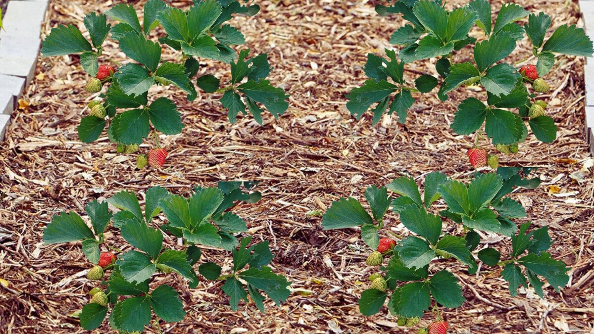 Клубника — мульча из опилок препятствует соприкосновению ягод с почвой, снижает риск гниения и заражения серой гнилью.