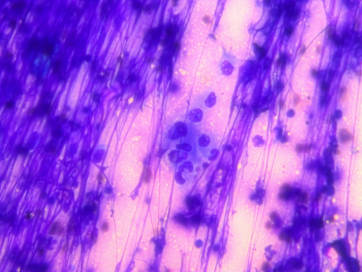 Неэпителиальная опухоль легкого (мазок-отпечаток). Окрашивание МГГ. Объективы 40x, 100x.
