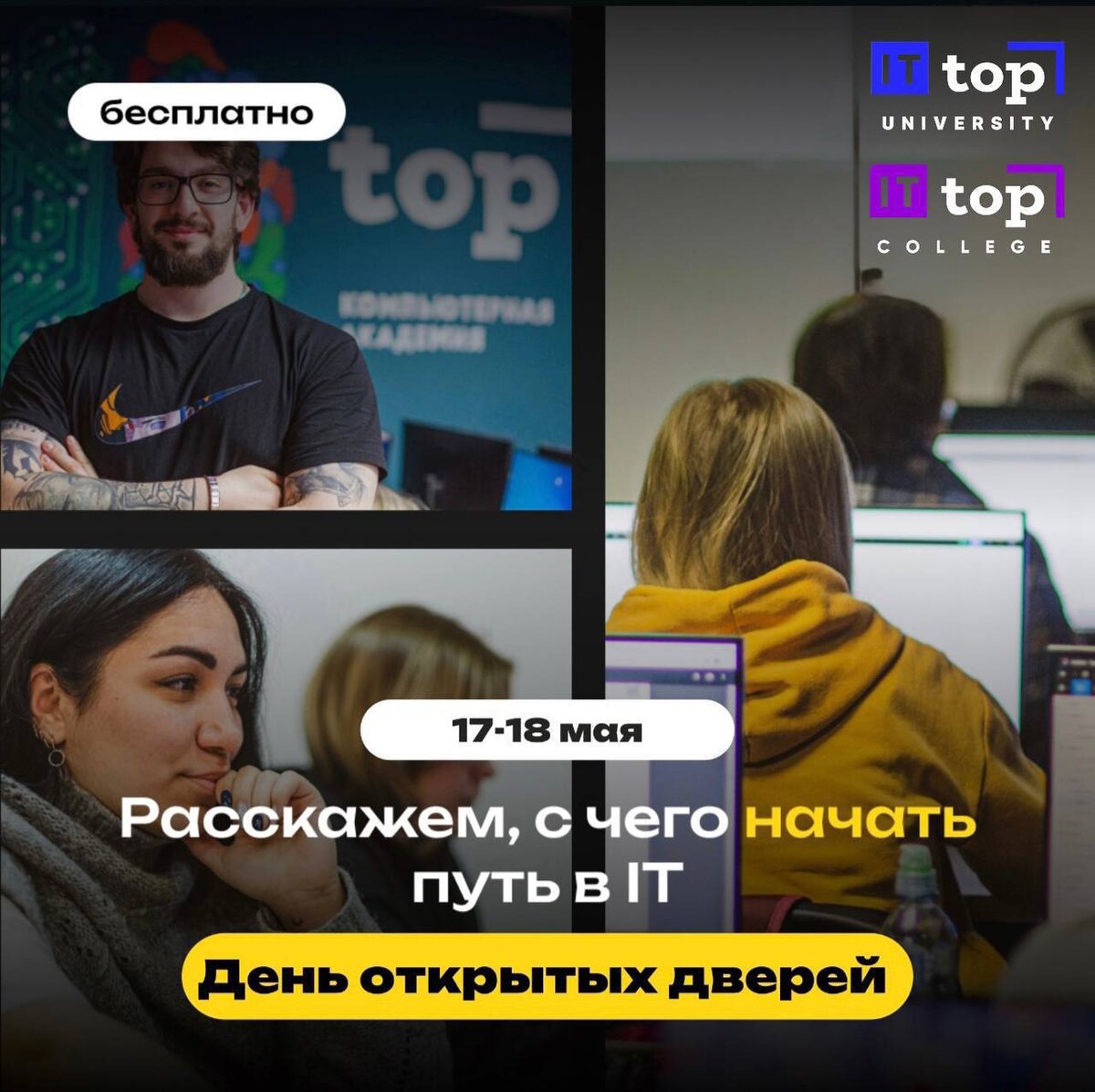 Бесплатные мастер-классы и дни открытых дверей Компьютерной Академии ТОП Пробный урок «Начни свой путь в IT» 🕐 15:00 🗓 17 мая 👥 для всех от 16 лет День открытых дверей в колледже Академии ТОП 🕐 16:00 🗓 18 мая 👥 14-20 лет День открытых дверей в университете информационных технологий «Академия TOП» 🕐 16:00 🗓 18 мая 👥 16-20 лет Подробнее в WhatsApp и по телефону +7(812)6026696 📍 ул. Итальянская, 2 #лекция Подпишись на Питер Бесплатно