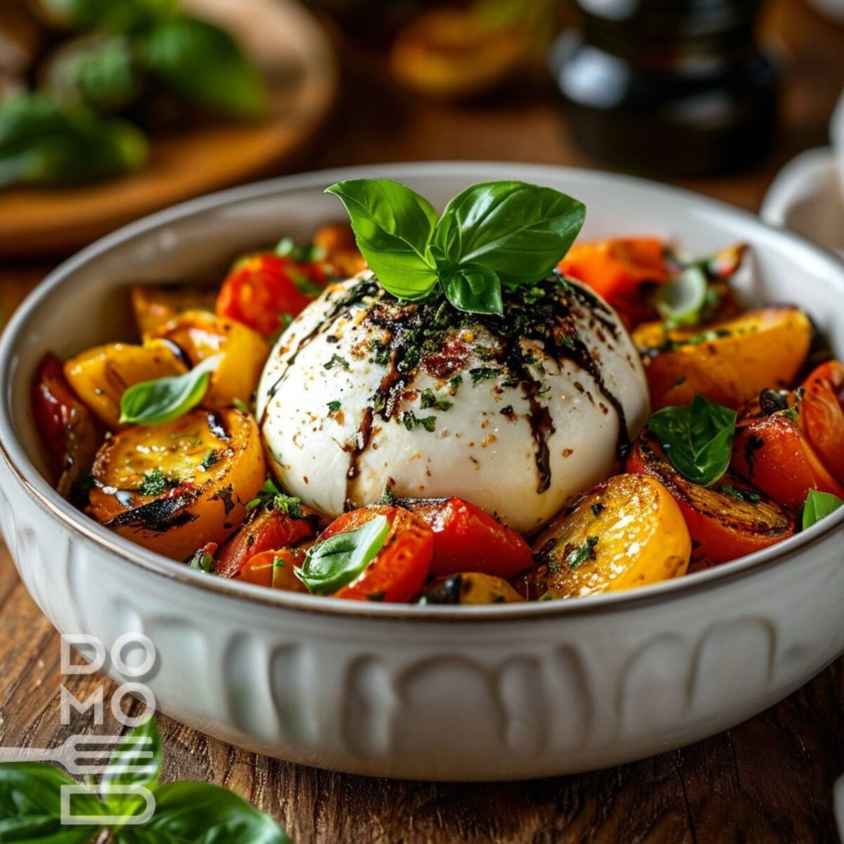 🥗 САЛАТ ИЗ ЗАПЕЧЁННЫХ ОВОЩЕЙ С БУРРАТОЙ Тёплый средиземноморский салат с карамелизированными овощами и нежнейшим сыром. ⏳ Время приготовления: 50 минут 🍽 Порций: 4-6 🔥 Калорийность: 320 ккал/порция 🛒 ИНГРЕДИЕНТЫ Овощи: • Сладкий перец (разных цветов) — 4 шт. • Баклажаны — 2 средних • Цукини — 1 шт. • Лук-шалот — 5-6 шт. • Помидоры черри — 500 г Для заправки: • Оливковое масло extra virgin — 5 ст.л. • Горчица крупнозерновая — 1 ст.л. • Мед жидкий — 1 ст.л. • Бальзамический уксус — 2 ст.л. Дополнительно: • Буррата — 2 шарика • Соль морская + перец свежемолотый 👨 ПОШАГОВЫЙ РЕЦЕПТ 1️⃣ Запекание овощей 1. Разогрейте духовку до 180°C с режимом конвекции 2. Нарежьте: - Перец — полосками 2 см - Баклажаны/цукини — полукругами 1,5 см - Лук — пополам 3. Выложите на противень, сбрызните 2 ст.л. масла и уксусом 4. Запекайте 30-40 минут, перемешивая 2 раза 2️⃣ Приготовление заправки 1. Взбейте венчиком: - 3 ст.л. оливкового масла - Горчицу - Мед 2. Добавьте щепотку соли 3️⃣ Сборка сала