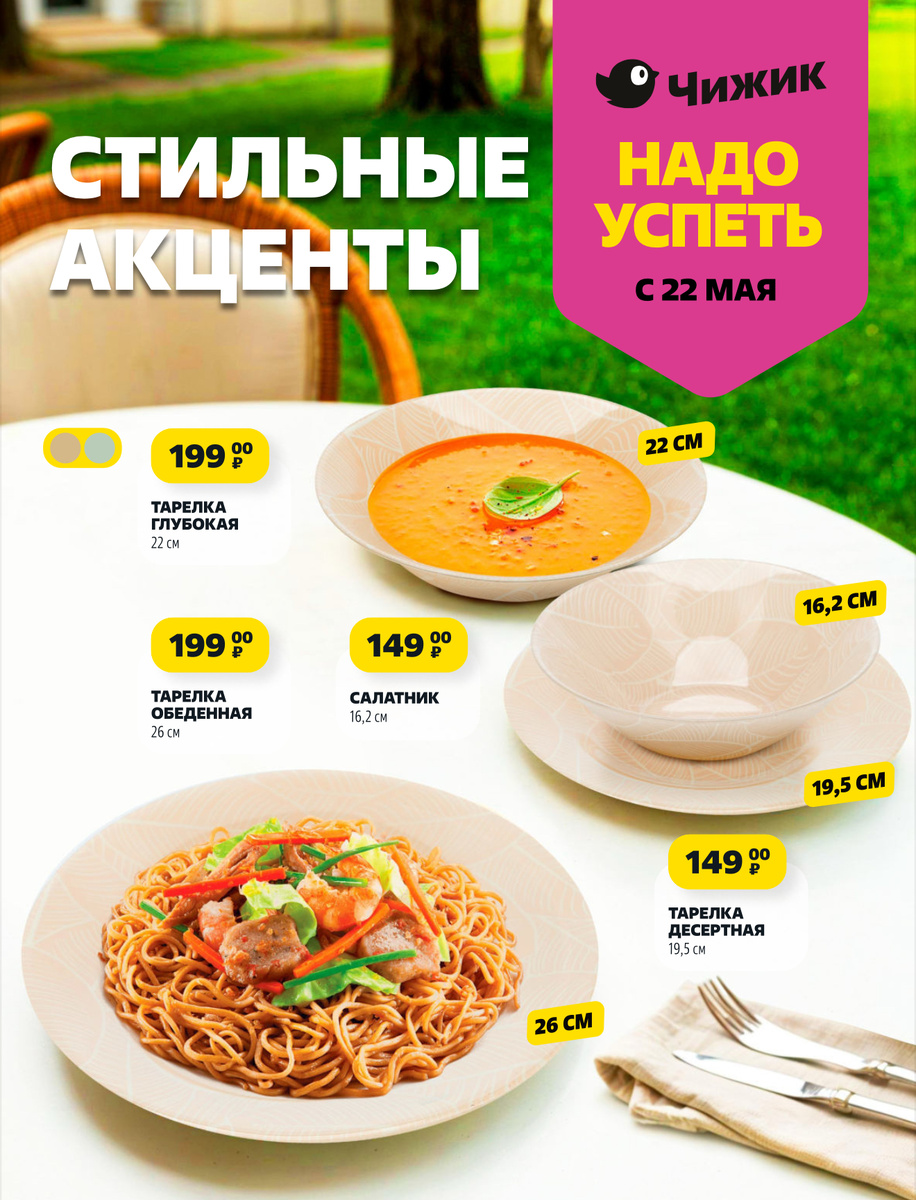 Приветствую всех читателей! Решила поделиться первыми эмоциями от нового каталога магазина Чижик! Уже совсем скоро, на следующей недели, с 22 мая — стартует обновление ассортимента, так что в этой статье, рассмотрим анонс и новый завоз ассортимента в магазин. Сразу хочу напомнить: всё, что вы видите на моих ресурсах — это чистая информатика. Никакой рекламы, никаких обязательств покупать. Это просто моя попытка делиться свежими акциями, ценами и отзывами. Моё мнение субъективно, и цель одна — поддержать вас в поиске выгодных покупок! Эта статья буквально набрана на бегу, потому что меня ждёт ещё столько интересного впереди! Прошу простить, если где-то выскочат маленькие шероховатости текста — стараюсь писать оперативно, чтобы информация пришла к вам первой! 😅 Тем, кто пропустил мой предыдущий обзор о новинках в ЧИЖИКе, обязательно зайдите сюда 👇 Начну с яркой обложки. Заметила свежую коллекцию посуды. Тут. десертные тарелки, глубокие обеденные и просторные салатники. Материал