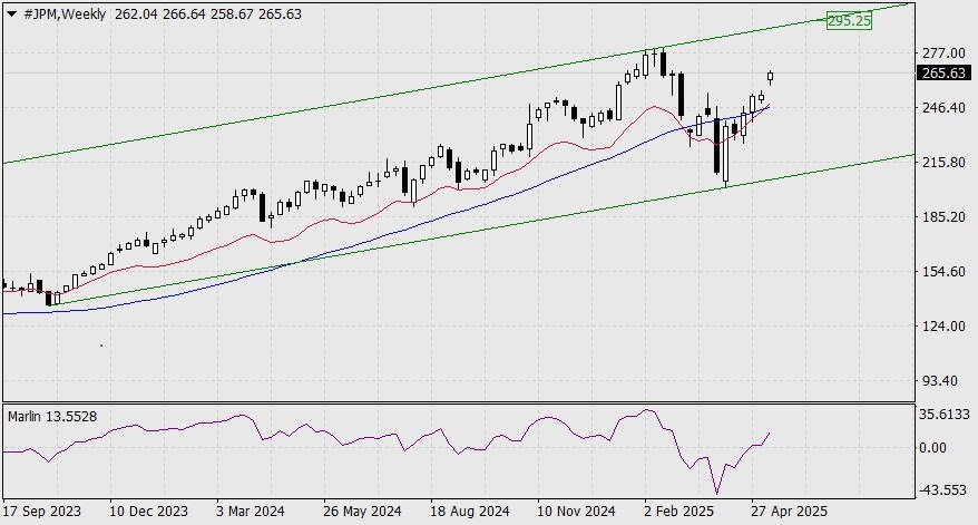 https://basechop.ru/wordpress/?p=42733 Покупка акций компании JP Morgan Chase (#JPM) JP Morgan Chase – американский транснациональный финансовый конгломерат. На недельном графике цена ускорила рост, вероятно, с намерением отработки верхней границы ценового канала. Целью может быть уровень 295.25. Также ускорил рост и осциллятор Марлин, сразу по выходу в положительную область. Возможно, цена выйдет за верхнюю границу ценового канала. На дневном графике цена растёт над обеими индикаторными линиями. Осциллятор Марлин развивает рост с явным замедлением от цены, что, с одной стороны, увеличивает риск разворота, а с другой стороны может поддержать рост цены в дальнейшем, так как медленный рост осциллятора отдаляет его вхождение в зону перекупленности. Покупку акций компании JP Morgan хеджируем продажей Kraft Heinz (#KHC). Kraft Heinz – американский пищевой конгломерат. На графике недельного масштаба цена снижается под линией баланса. Линия Крузенштерна не видна из-за недостаточности исто