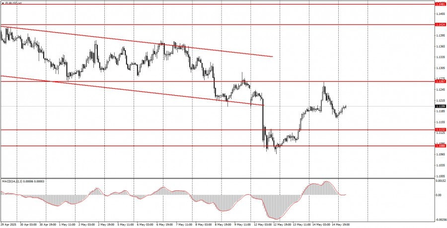 Валютная пара EUR/USD в среду продолжала восходящее движение примерно полдня. Особенно «порадовал» новый «взлет» евровалюты, хотя наверняка речь шла об очередном падении доллара. Евро и фунт остаются статистами в этой опере имени Трампа. Меняет свою цену и привлекательность только доллар. Вот и вчера рынок полдня продолжал избавляться от американской валюты на фоне замедления американской инфляции. По сути, снижение инфляции является лишь формальным поводом продавать доллар. ФРС в любом случае ждет ускорения потребительских цен, а в апреле тарифы Трампа попросту не успели повлиять на цены в США, так как многие ритейлеры подстраховались на этот случай, закупили товары заранее, а также не стали сразу же поднимать цены. Поэтому инфляция в любом случае ускорится, а ФРС не будет снижать ключевую ставку в ближайшее время. Однако рынок получил новый повод избавиться от доллара, которым воспользовался на все…