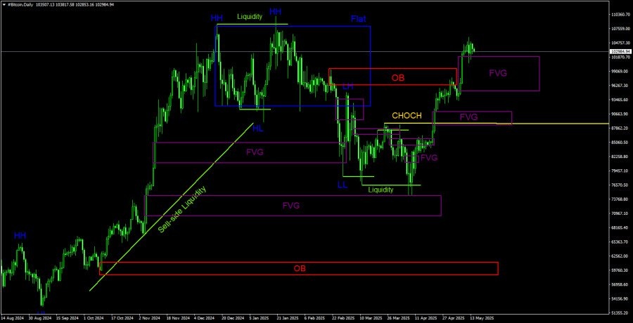 На обоих таймфреймах в данное время у нас есть только «бычьи» паттерны FVG. Мы видим, что на 4-часовом ТФ биткоин скорректировался к ближайшему паттерну FVG, однако на этот раз продолжить восходящее движение не удалось, и предыдущий локальный максимум преодолен не был. Формально мы получили реакцию от последнего FVG, но теперь цена может уйти на второй виток коррекции. Напомним, что первые признаки смены тенденции появятся, когда «бычьи» паттерны начнут игнорироваться и/или начнутся снятия ликвидности на продажу.