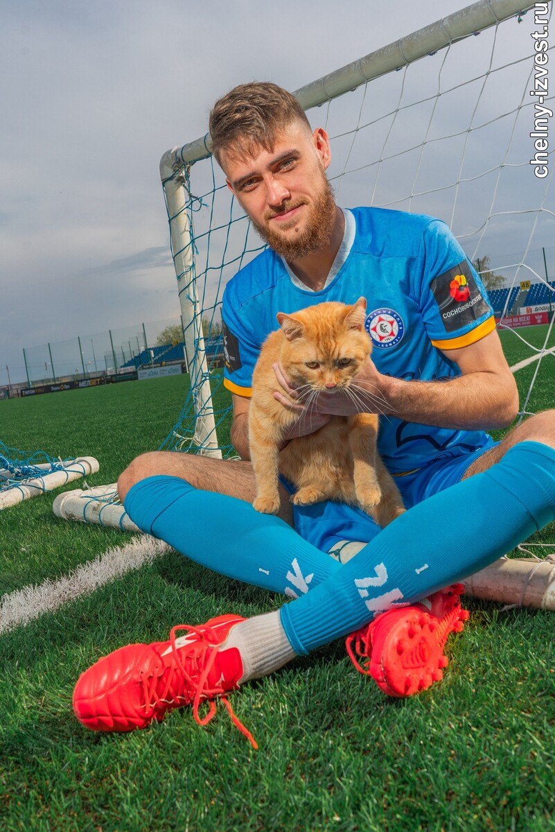 «Дайте мне вот этого серенького котика, он похож на моего домашнего», - сказал защитник ФК «КАМАЗ» Максим Бурко. Серенькая — это Рыся. Максим взял Рысю на руки, улыбнулся, Рыся разнежилась и у них получилось прекрасное общее фото.