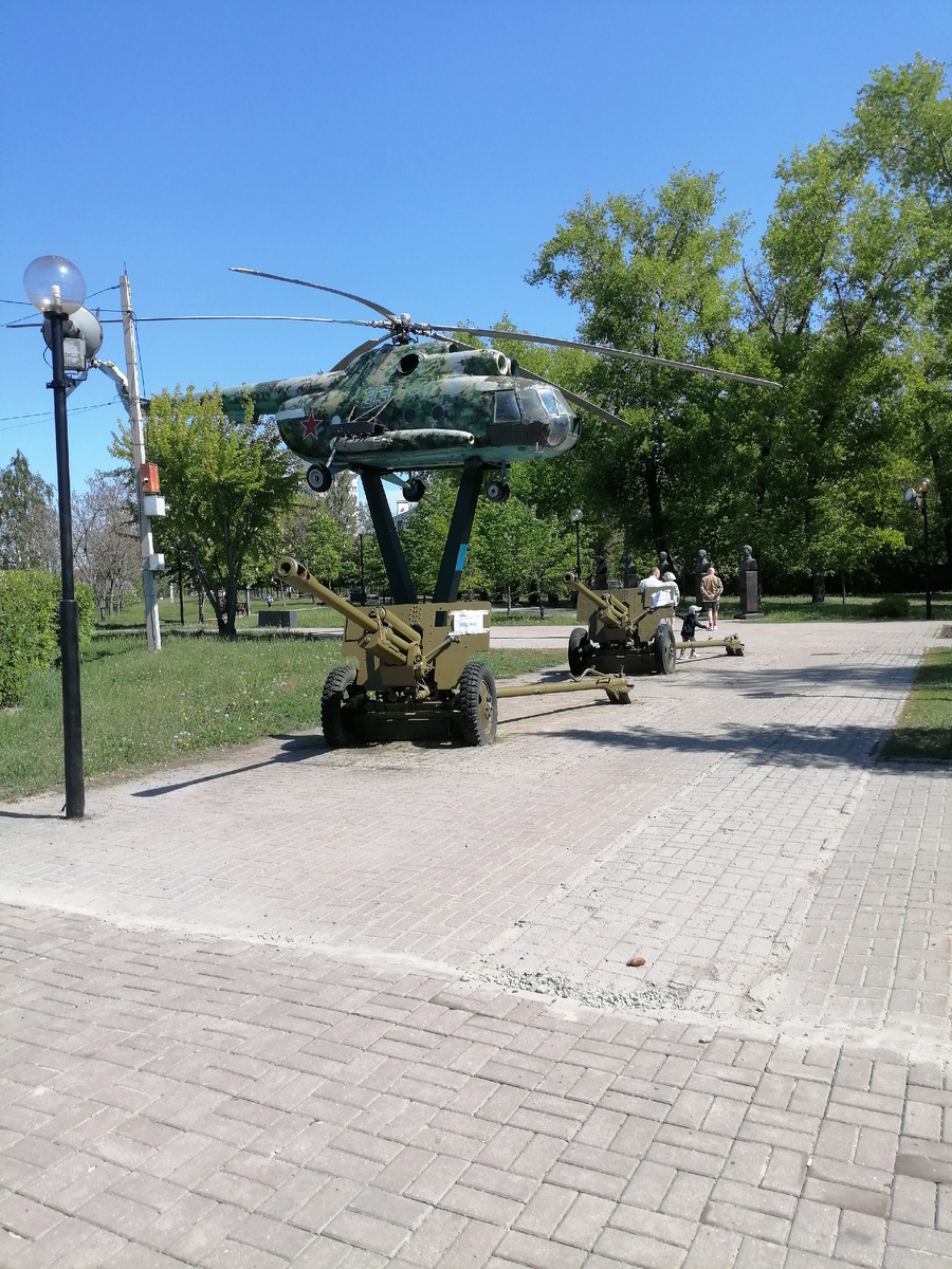 Территория музея большая. Стоит военная техника, вертолет с Афганской войны на котором видны следы от пуль,