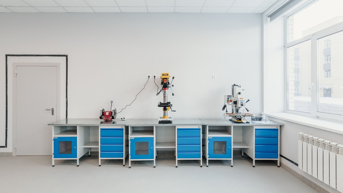 Просторные рабочие столы позволяют работать сразу нескольким ученикам. - Станок для резки и сверления дерева и металла.