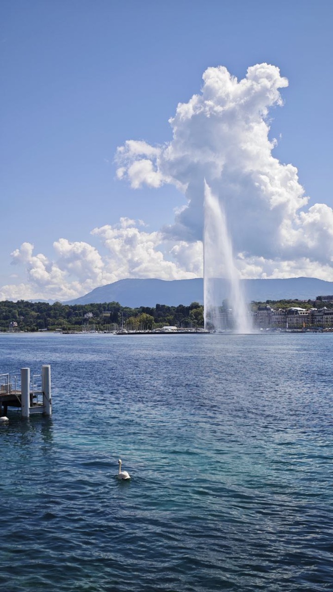 Посреди Женевского озера бьёт вверх, высоченный фонтан. Очень красивая набережная.