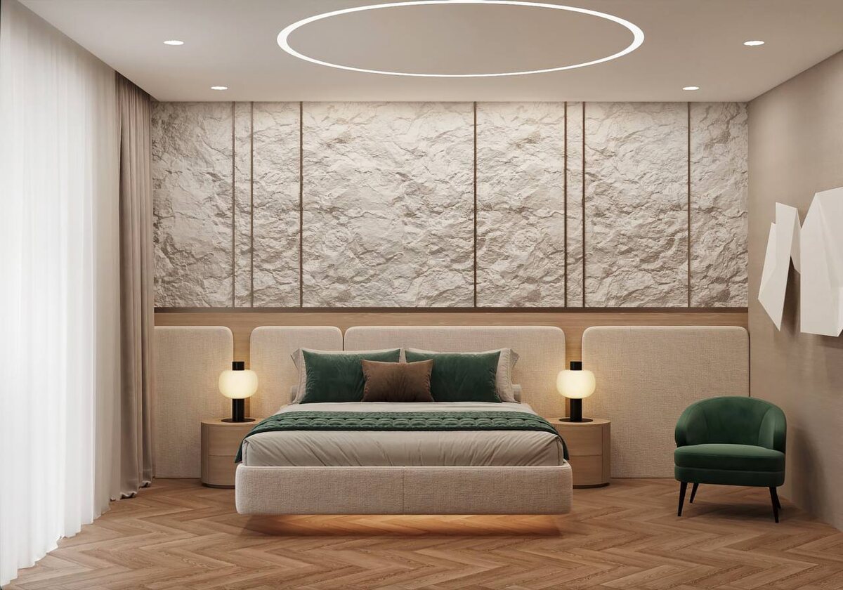 Дизайн интерьера спальни мастер, дом кп Булатниковский 320 м2 ❤️ Ещё один вариант по этой спальне мастер - старались сделать максимально природные, тёплые оттенки, натуральные фактуры камня, дерева, плюс акцент зеленый, глубокий цвет. И дополнение к образу интерьера - это картина с бархатистым песком, голубовато-зеленым морем, светильники по бокам, как будто два маяка, которые светят кораблю в дальнем плавании.🛀 Тест по определению стиля интерьера designproject.info/questions/ a-s-buro.ru/ www.instagram.com/as_buro_in... vk.com/a.s.buro https://dzen.ru/id/5b1849f19d5cb36f27f58025 www.facebook.com/asburo1/ #асбюро #артемболдырев #проектдома #дизайндома #спальня #современнаяспальня #современныйинтерьер #интереьрминимализм #дизайнспальни #дизайнкоттеджа