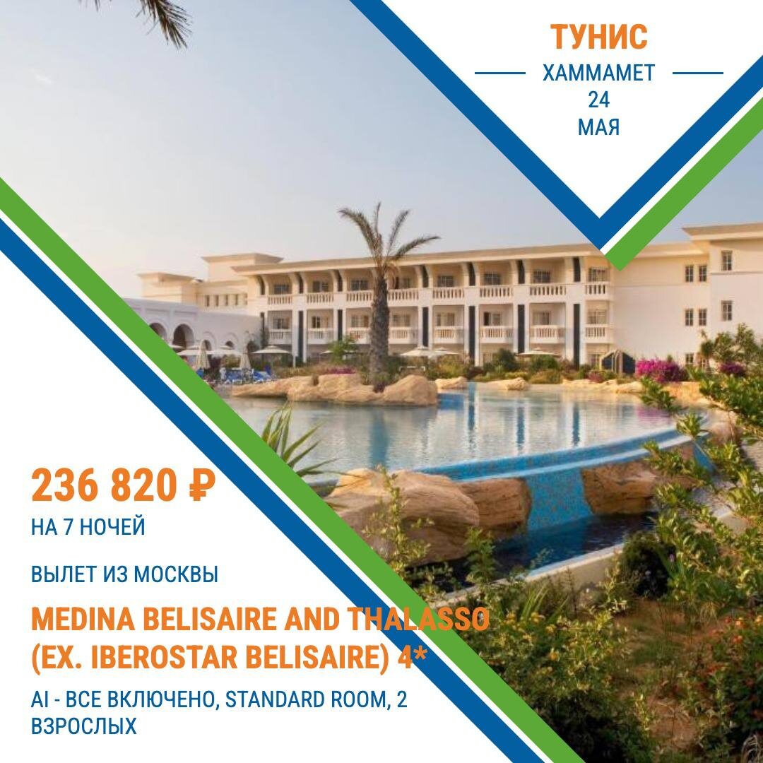 🔥Тунис🔥 Универсальный отель, в котором каждый клиент будет чувствовать себя желанным гостем. Просторные и элегантно оформленные номера. На территории есть 4 конференц-зала, 2 открытых и крытый бассейны, детский клуб и игровая площадка. ✈️ из Москвы → Тунис, Хаммамет 📅 24.05 на 🌙 7 ночей 🌴 Medina Belisaire And Thalasso (Ex. Iberostar Belisaire) 4* 🛌 standard room, 2 взрослых 🍽 AI - Все Включено 🔥 236 820 RUB 👩💼Менеджер по туризму/страховой агент Швыряева Елена ☎️79030097240 ↘️ https://api.whatsapp.com/send?phone=79030097240 ➡️https://dzen.ru/id/67f3cd713945790e239821f4 https://➡️share.looky.com/looky/Elena_77S ➡️t.me/Strahovka8877