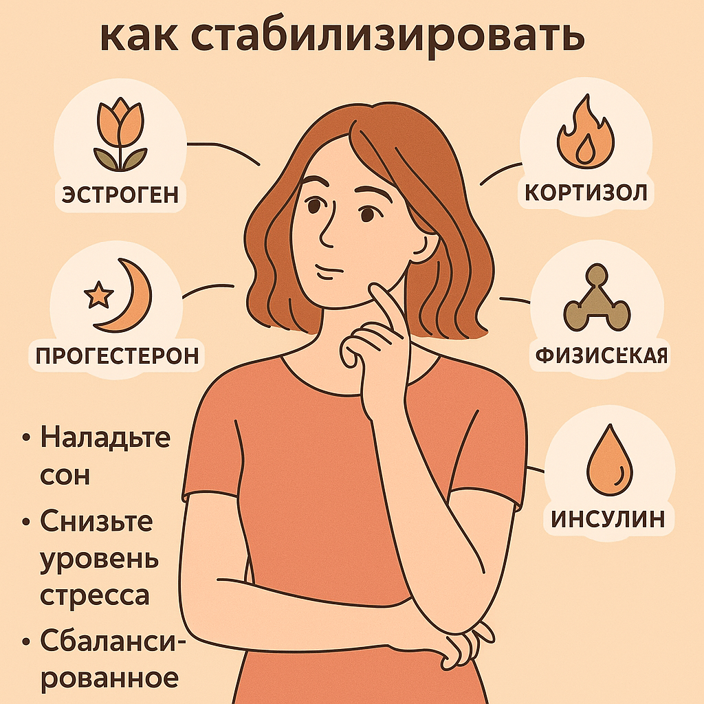 Гормоны — это биологически активные вещества, которые регулируют практически все процессы в организме: от сна и настроения до веса, либидо и менструального цикла. Особенно сильное влияние гормоны оказывают на женское здоровье. Когда гормональный фон в норме, женщина чувствует себя энергичной, уравновешенной и здоровой. Но малейшие сбои могут вызывать раздражительность, усталость, лишний вес, проблемы с кожей и даже депрессию. Разберёмся, какие гормоны играют ключевую роль в организме женщины и как можно мягко и безопасно стабилизировать их уровень. Один из главных женских половых гормонов. Отвечает за формирование женских черт, регулирует менструальный цикл, влияет на здоровье костей, кожи, сосудов и настроение. Недостаток: сухость кожи, снижение либидо, раздражительность, остеопороз.