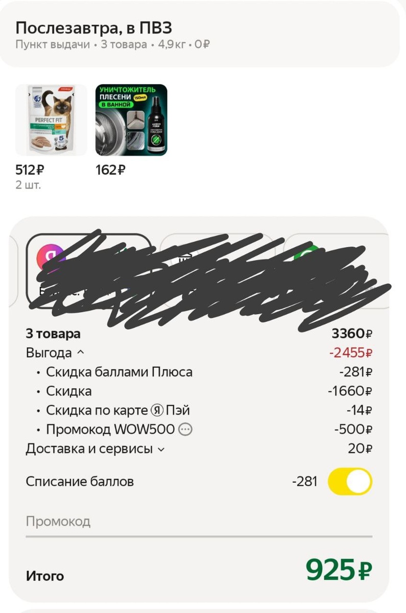 1. Подписки Начала я с того, что разгребла все свои подписки, а у меня их куча. Не считая всяких сберпрайм, яндекс плюс и тому подобное, я подписана на разных блогеров здесь, в вк и в тг. Все пересмотрела и отписалась от ненужного, итого получилось: 300+200+333+800=1633 Теперь каждый месяц на подписки должно уходить на 1633 р меньше. 2. Яндекс плюс + яндекс карта Т.к. я часто езжу на такси и вряд ли в ближайшем будущем смогу от него отказаться, я оформила карту ЯндексПей, чтоб копить баллы на такси. Теперь с этой карты оплачиваю такси и доставку из яндекс Лавки. А вчера случайно зашла в Маркет (обычно я его не использую вообще) и увидела, что мне дают промокод 500р за покупку от 1500 + персональные скидки. И там был корм для кошки, который мы постоянно покупаем: Perfect Fit паштет. У нас уходит 1 пакетик в день. Обычно беру его в сетевых за 29 р пакетик. Иногда приходилось и в Самокате заказывать по 36 р пакетик. А тут вышло 925 рублей за 56 пакетиков + средство от плесени (его я добав