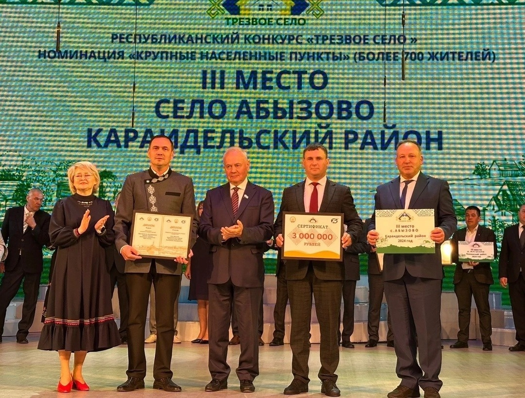 Сегодня, 15 мая, в Уфе огласили итоги престижного республиканского конкурса "Трезвое село". По итогам многомесячных стараний, победы в муниципальном этапе, более 80 проведенных культурно-массовых, спортивных, оздоровительных, экологических и патриотических мероприятий село Абызово стало призером республиканского конкурса. Абызовцы заняли почетное третье место в номинации "Крупные населенный пункты" и были награждены сертификатом в 3 миллиона рублей. От всей души поздравляем земляков с этим прекрасным достижением! Поверьте, они действительно старались и целых два года шаг за шагом шли к своей цели. В период проведения республиканского этапа в селе проведено 81 мероприятие. Абызовцы являются лидерами по количеству и качеству проведенных мероприятий в районе, посвященных пропаганде здорового образа жизни, году семьи и патриотической направленности с участием актива села и местной школы. Здесь проведены массовый забег «Соединяя берега», выходные по зимней рыбалке, мероприятия в рамках муни