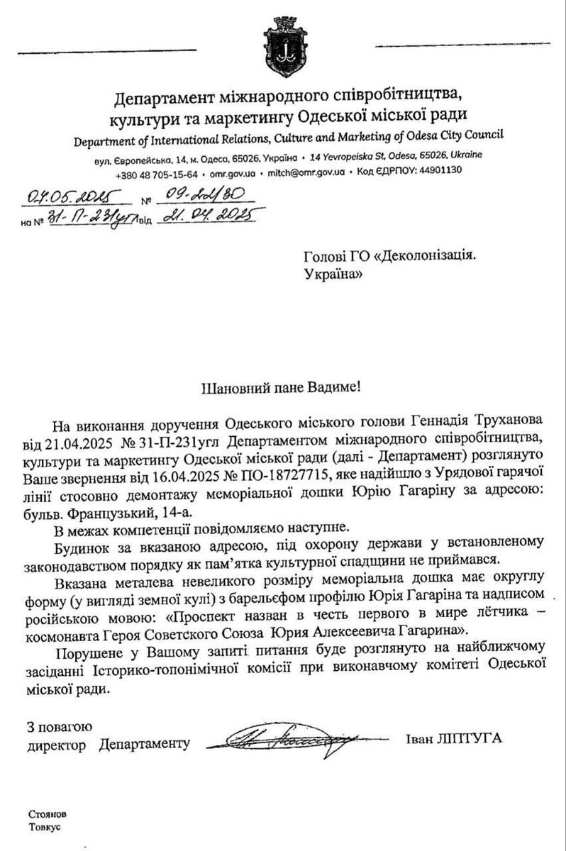 В обращении говорилось, что организация требует демонтажа конкретной мемориальной доски Юрию Гагарину на Французском бульваре. Памятный знак там выполнен с высокой художественностью – доска округлой формы, символизирующей Землю, с барельефом профиля Юрия Гагарина и надписью на русском языке: «Проспект назван в честь первого в мире летчика - космонавта Героя Советского Союза Юрия Алексеевича Гагарина». Видимо, совокупность факторов оскорбила достоинство русофобов. На донос пришел официальный ответ. В нем говорилось о том, что соответствующий департамент при мэрии Одессы рассмотрел обращение. Дом, на котором установлена памятная доска, не является объектом культурного наследия, как и знак в честь Гагарина. И вопрос о сносе памятника будет рассмотрен на ближайшем профильном комитете.