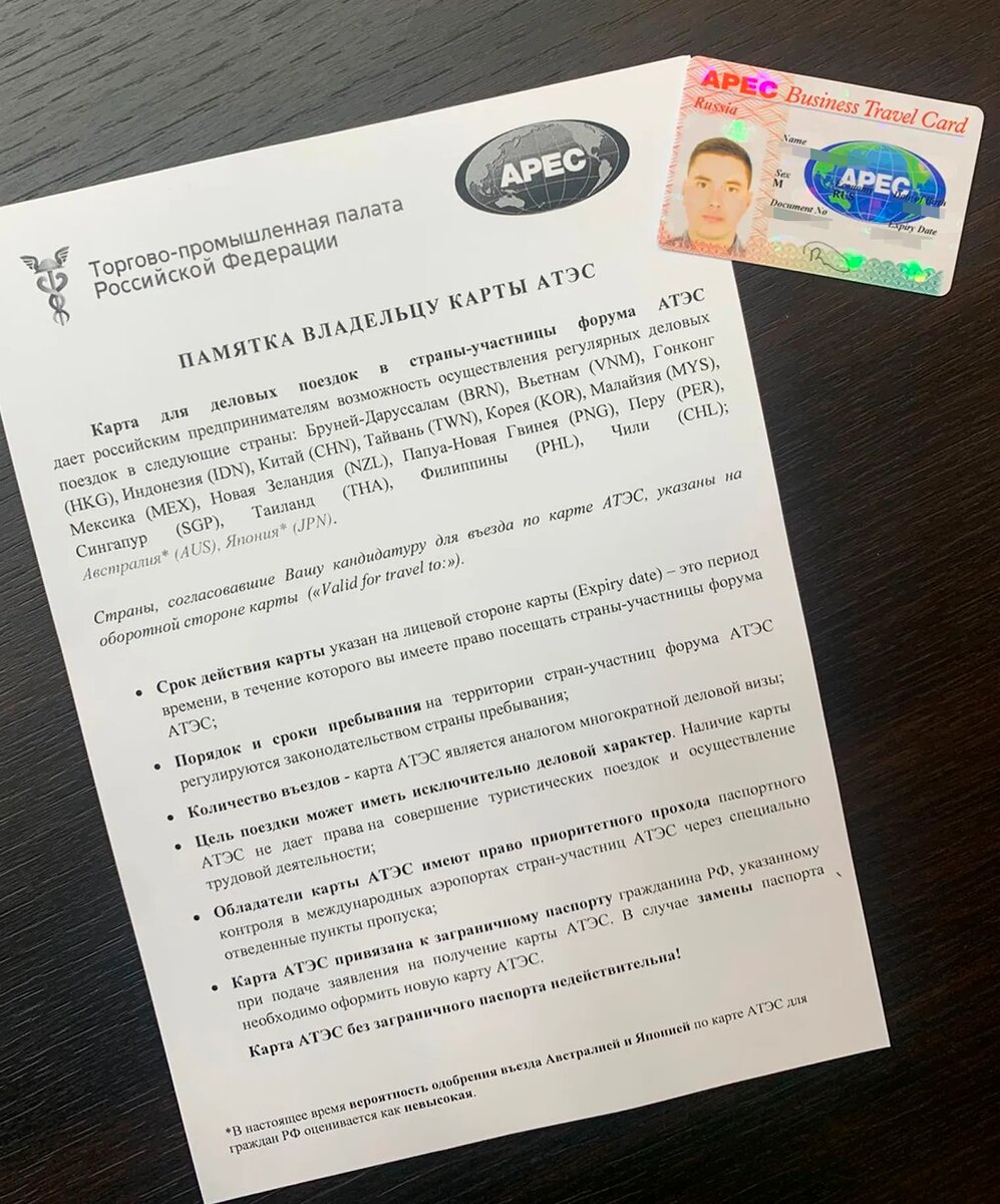 В начале декабря со мной связалась представительница ТПП Владимира, которая любезно помогала мне и отвечала на вопросы, и сообщила, что мне одобрили временную карту АТЕС. Временная, поскольку Япония еще рассматривает мой запрос, а я уже мог пользоваться картой для въезда в остальные страны. У меня одобрено 16: Бруней-Даруссалам, Чили, Китай, Китайский Тайбэй, Гонконг, Индонезия, Корея, Малайзия, Мексика, Новая Зеландия, Папуа-Новая Гвинея, Перу, Филиппины, Сингапур, Таиланд, Вьетнам. Все названия стран указаны на обратной стороне полученной карточки.