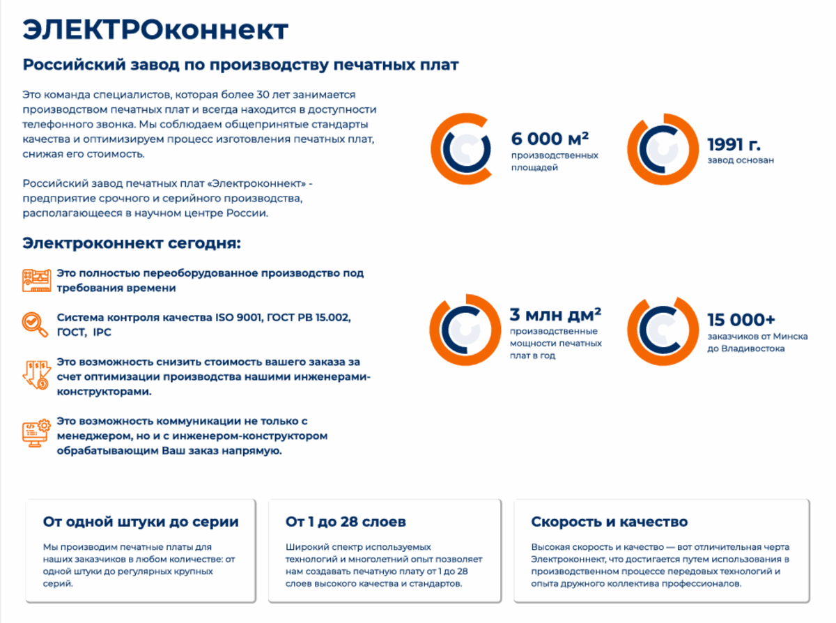 +7 (383) 336-10-03 Наши преимущества: ✔ Сделано в России. Мы предоставляем документы, подтверждающие наличия печатных плат, сделанных в России, в составе вашего изделия, для участия в тендерах. ✔Срочное производство. Мощности завода позволяют выполнить заказ двухслойной платы от 2 дней, многослойной от 4х дней. ✔ Сопровождение каждого заказа. Наши специалисты всегда на связи и готовы проконсультировать Вас. «ЭЛЕКТРОконнект» - это Российский завод, поэтому у Вас не возникнет языкового барьера. ✔ Доставка. От одного дня по всей России ✔ Мы рядом. У нас есть представительства в Москве, Санкт-Петербурге, Ростове-на-Дону, Перми,Екатеринбурге, Минске. ✔ Контроль. - Качества материалов. Мы р