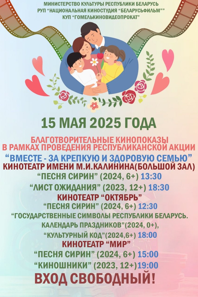 15 мая в рамках республиканской акции «Вместе – за крепкую и здоровую семью» кинотеатры города Гомеля проведут благотворительные кинопоказы.