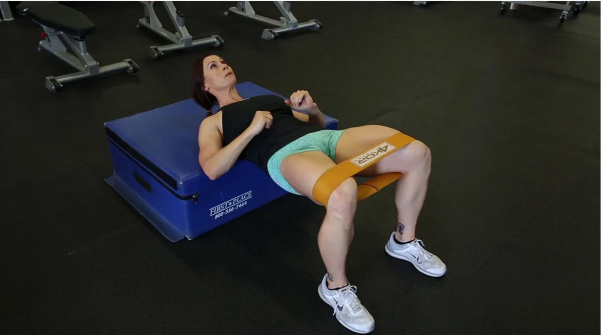 Наденьте ленту выше колен и толкайте таз вверх, преодолевая сопротивление. Идеально для «добивки» в конце тренировки!