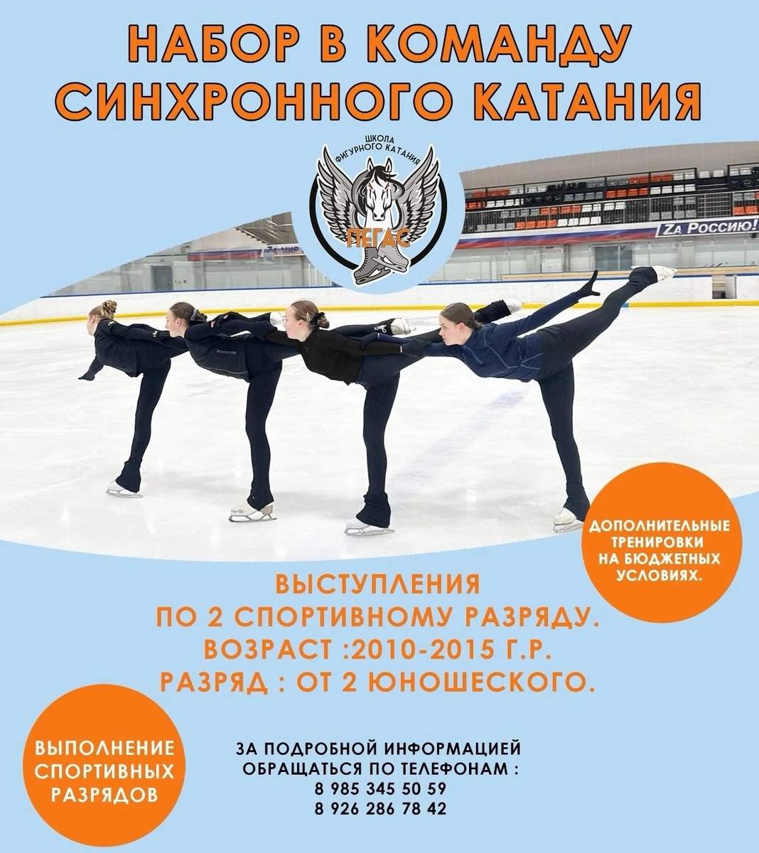 ✨ Школа фигурного катания Пегас г. Домодедово🪽 Открывает набор в команду синхронного катания на коньках ⛸️ Приглашаются: девочки и мальчики 2010-2015 г.р. от 2 юношеского разряда одиночного катания Сезон 2025-2026 Выступления команды по 2 спортивному разряду Удобное расписание 🩵 Ледовый дворец "Авангард" ул. 2-я Коммунистическая, 2а Запись по телефонам: +7 985 345-50-59 +7 926 286-78-42 🏢 Спортивный комплекс "Авиатор" 📍 г. Домодедово, мкрн.Авиационный, ул.Гагарина, д.7 ✅ Мероприятия Домодедово https://dzen.ru/id/66f10385cc4c5a16f7b5fb02 http://vk.com/domodedovo_events http://dzen.ru/domodedovo_events