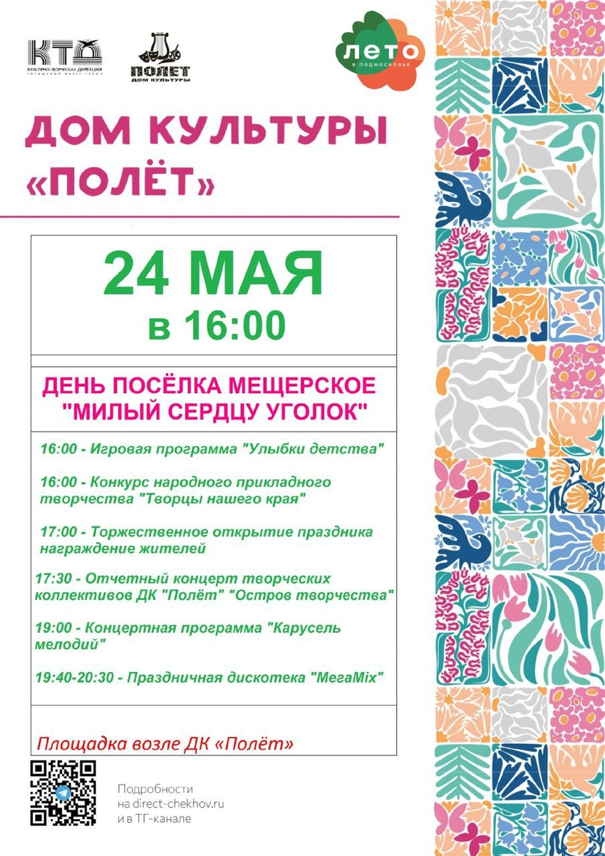 ✨ Приглашаем на День поселка Мещерское на площадь возле ДК Полет ✅ 🤗Для гостей подготовили концерт творческих коллективов ДК "Полёт", конкурс-выставку народного творчества. 📜Обязательно будет награждение жителей 🚫 Возраст: 0+ 📆 24.05.2025 🕛 16:00 🏢 ДК «Полёт» 📍 г.о. Чехов, п. Мещерское, д.15 (пристройка) 🪙 Вход свободный❗️ #webЧехов ✅ Мероприятия Чехов https://dzen.ru/id/66cc4b48e9ef144699238a51 http://vk.com/chekhov_events http://dzen.ru/chekhov_events