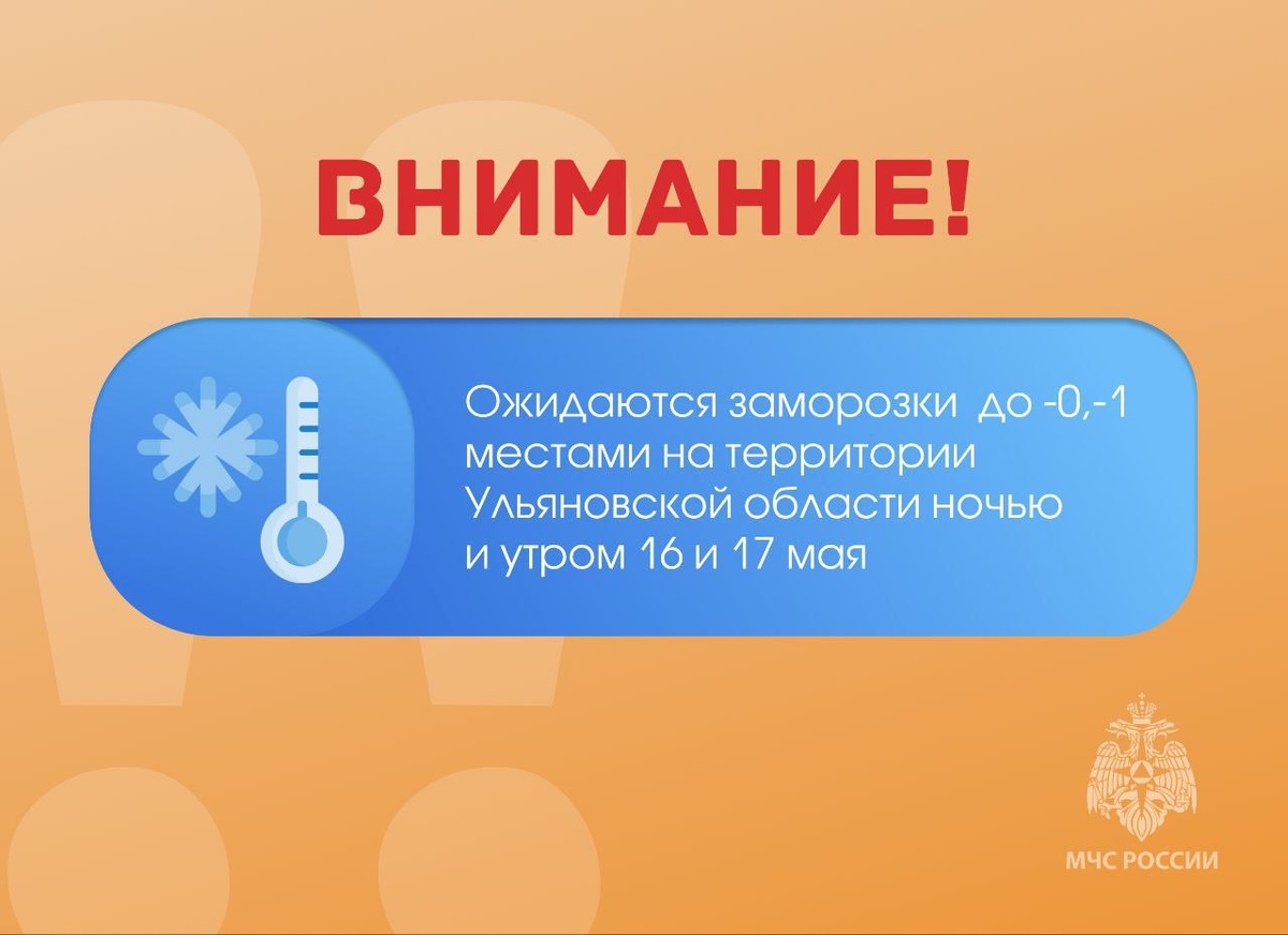 На Ульяновск надвигаются заморозки В Ульяновской области ночью и утром 16 и 17 мая ожидаются заморозки до 0...-1 градусов Цельсия. МЧС настоятельно советует ульяновцам: - не оставляйте без присмотра включённые электроприборы, - обеспечьте защиту для сельскохозяйственных растений от заморозков, - автовладельцам и пешеходам следует быть более внимательными на дорогах.