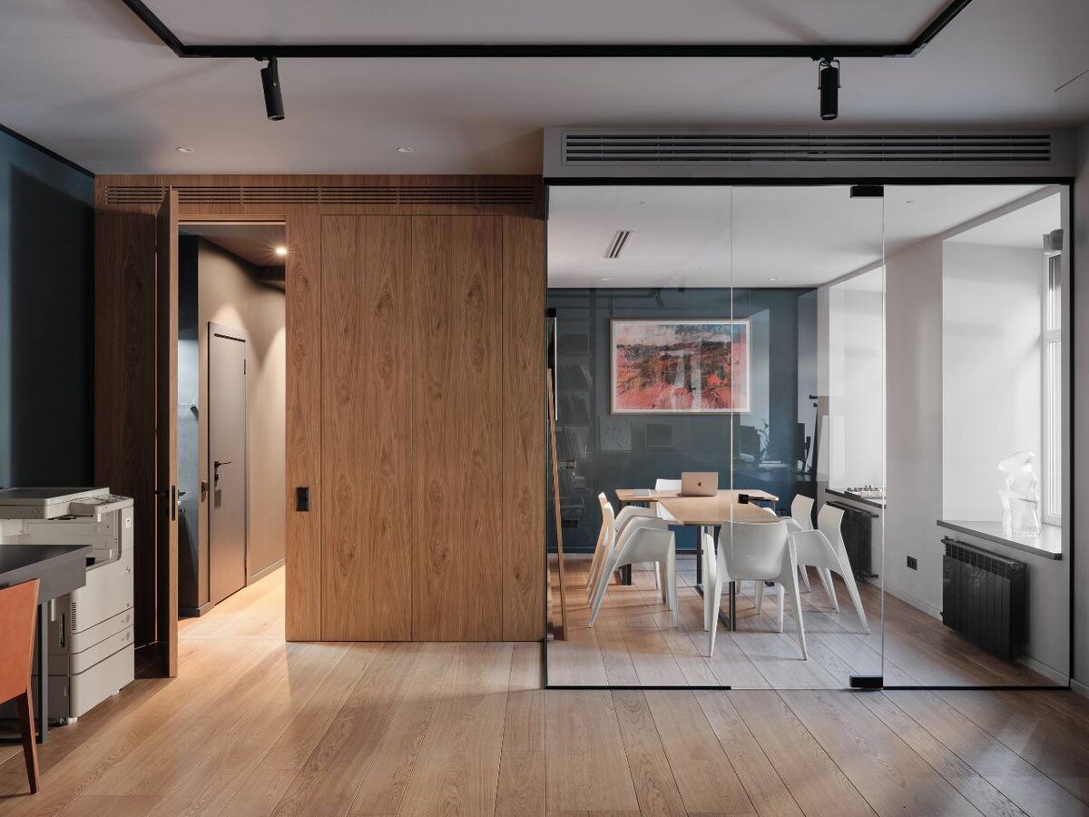 Архитектурный open space команды HAUBAUS, Петербург и шахматы Размышления нашей редакции на тему «Если бы офис HAUBAUS был человеком, каким бы он мог быть?» Нам представляется петербуржец, интеллигент без возраста, с выраженным чувством стиля и аутентичным бэкграундом. Представьте: дореволюционный дом в сердце Петроградки, собственный вход в арке дома, двор с историей, много солнца в окнах и современное интерьерное решение пространства, где эргономика тщательно продумана и у каждой детали есть своя функция. Площадь офиса бюро всего 70 квадратов, однако, здесь есть всё необходимое для работы команды: рабочая зона архитекторов, стеклянный кабинет-переговорка шеф-архитектора, скрытая кухня и даже гардеробная с зоной хранения. Общее решение офиса — минимум деталей + максимум воздуха, чтобы ничто не отвлекало от творческих инсайтов. Палитра офиса — графит, белый, камень и выбеленный дуб. Полистилистика в действии: минимализм, но не скучный, а авторский. Это, кстати, любимый подход Вячес