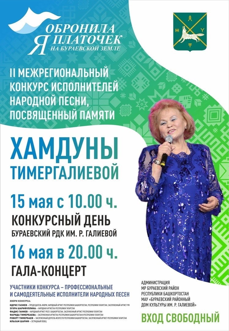 15-16 мая в селе Бураево состоится II Межрегиональный конкурс башкирской и татарской народной песни памяти Хамдуны Тимергалиевой «Обронила я платочек на Бураевской земле». Первый день будет конкурсным, во второй день – гала-концерт. В этом году на участие в конкурсе поступило более 30 заявок от профессиональных артистов и самодеятельных исполнителей Башкортостана и Татарстана. Оценивать конкурсантов будет жюри под председательством народного артиста Башкортостана и Татарстана, заслуженного артиста РФ Идриса Газиева. В составе жюри: народная артистка РТ, солистка Татарской госфилармонии им. Г. Тукая Зухра Шарифуллина, народный артист РБ, заслуженный артист РТ Фадис Ганиев, заслуженная артистка РБ Фарида Тимербаева, заслуженный деятель искусств РБ Роберт Тимербаев, популярный певец двух республик Ильхам Шариф. Мероприятие направлено на увековечение памяти народной артистки Башкортостана и Татарстана Хамдуны Тимергалиевой; выявление, развитие и поддержку молодых самодеятельных и профессио