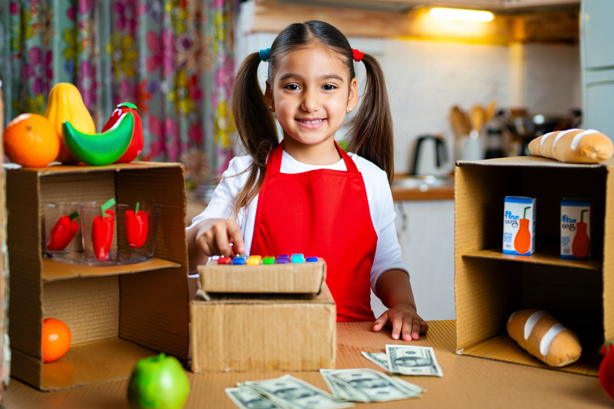 2. Реквизит: кассовый аппарат (можно сделать из коробки), бумажные «деньги», корзинка, ценники.