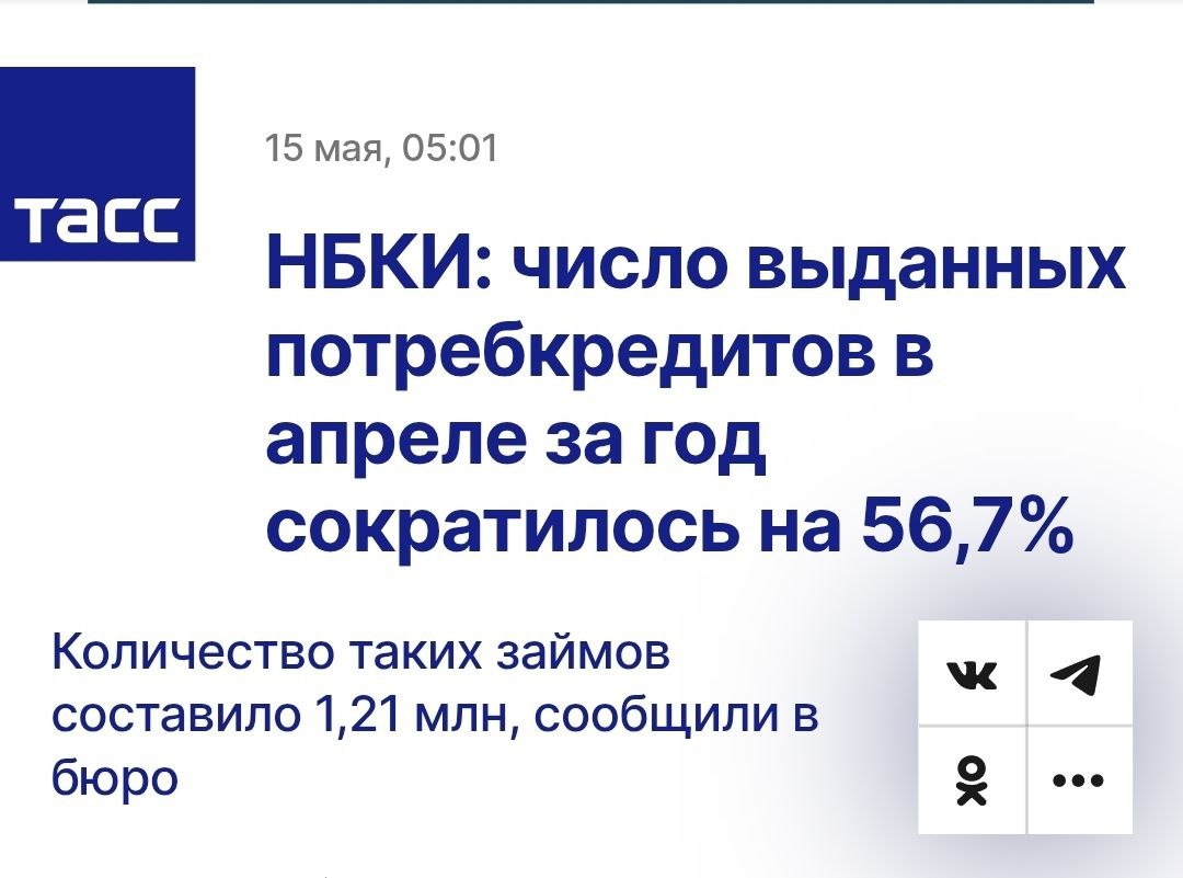 МОСКВА, 15 мая. /ТАСС/. Количество выданных в апреле 2025 года потребительских кредитов (кредитов наличными) сократилось на 56,7% по сравнению с аналогичным периодом 2024 года и составило 1,21 млн (в апреле 2024 года - 2,8 млн). Об этом сообщили ТАСС в пресс-службе Национального бюро кредитных историй (НБКИ) со ссылкой на данные кредиторов, передающих сведения в бюро. По данным НБКИ, выдача потребкредитов в апреле 2025 года сократилась на 4,3% по сравнению с предыдущим месяцем (в марте 2025 года - 1,27 млн ). "Существенное сокращение выдачи потребительских кредитов начиная со второй половины 2024 года стало следствием резкого роста ставок и ужесточения макропруденциальных лимитов. При этом с декабря темпы кредитования остаются примерно на одном уровне (1,2-1,3 млн ед. в месяц), что свидетельствует об определенной стабилизации. В этой связи стоит отметить, что аппетит банков к риску по-прежнему находится на довольно низком уровне. В этой связи хочу напомнить этот пост. Обращайтесь. П