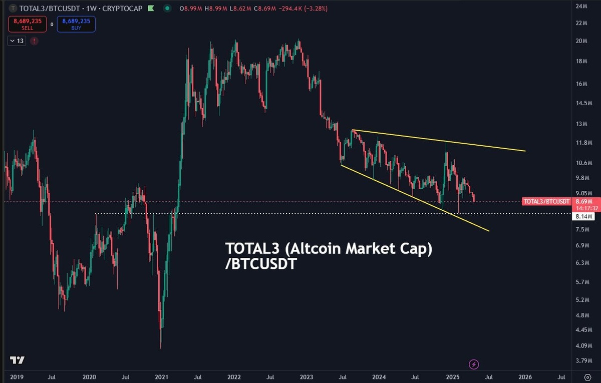 π Looking at the $TOTAL market cap of altcoins compared to $BTC, it's still hanging around those cyclical lows