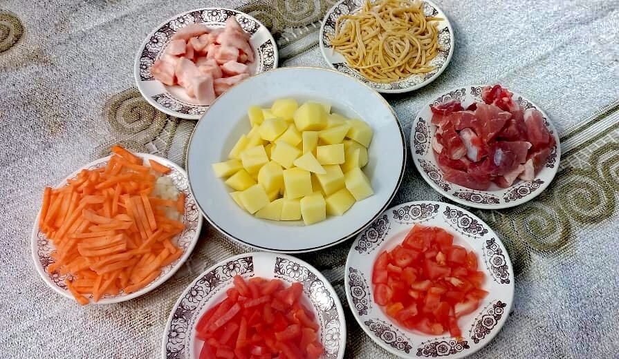 Я очень люблю готовить, а готовить на костре вдвойне. К сожалению, именно сейчас я в заточении четырех стен квартиры, а на улице серость и льет дождь. Но никто ж не мешает мне вспомнить тот вкус лагмана, правда?) А заодно и с вами поделиться рецептом. Вообще, блюда, приготовленные на природе, имеют свое очарование. Думаю, это известно всем. Я стараюсь готовить на огне все, что угодно, главное, чтобы время позволяло. Потому как продолжительность готовки все же иная, нежели на газу. Тут и за огнем иначе следить нужно, и при необходимости дрова колоть, если в запасе мелкие закончились. Итак, в этот раз, как вы уже поняли, я варила лагман. Как полагается - в котелке. Как никак, на костре. Обычная кастрюля тут не подойдет. Масло я не использовала совсем. В качестве альтернативы ему у меня было сало, которое я отрезала от лопатки, которая тоже пошла в расход. Сало подтопила, при этом закидав в мангал побольше дров. Мне нужно было, чтобы мощность огня была приличной. После ее пришлось регулир