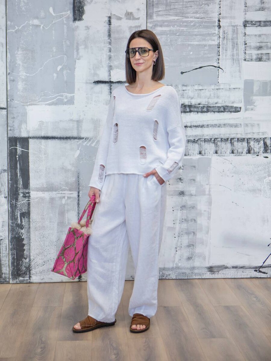 Вязаный джемпер с элементами деконструкции в стилистике гранжа. Объемная фактура, асимметрия и белый цвет делают его эффектным акцентом в образе.