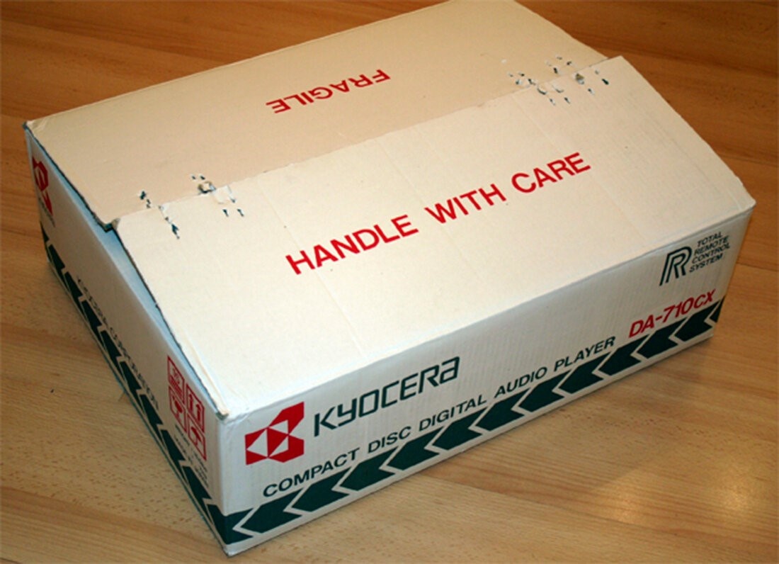 Данный товар (категория нераспроданный) удалось приобрести у одного из дилеров по продаже электроники в США. Качественное складское хранение сберегло упаковку в первозданном виде. Приятные хлопоты по извлечению раритета начинаются с работы пассатижами. Картонные отвороты сшиты медными скобами, которые не сразу поддаются удалению. Внутри коробки привычный антураж стандартов упаковки тех лет. Первое впечатление, это запах новой техники, который вырывался наружу спустя более, чем четверть века. За такой срок, что CD плеер провел упакованным, в странах могут происходить значительные изменения, например Китай стал ведущей индустриальной державой. На одном из рекламных вкладышей обнаружилось основное достижение разработчиков, что данный аппарат стал решением проблемы резонансных явлений, которые, по-видимому мучали аудиофильскую общественность тех лет. Приводим основной тезис: " Поскольку аудио дорожка компакт-диска является микроскопически узкой, вибрация может привести к неправильному