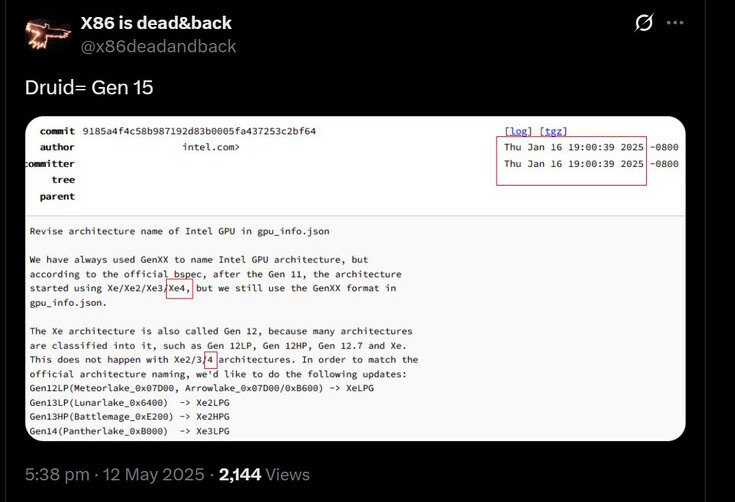 В сети появились новые данные о разработке Intel следующего поколения графических процессоров Arc Xe4 Druid. Инсайдер x86deadandback обнаружил следы активности инженеров компании, датированные январем 2024 года, где упоминается работа над архитектурой Gen 15 (Xe4). Эти находки согласуются с более ранними заявлениями представителя Intel Тома Петерсена, который в декабре 2023 подтвердил завершение разработки Xe3 Celestial и переход команды на следующее поколение. При этом текущий статус более близкого к релизу поколения Xe2 Battlemage остается неясным — последние утечки указывают лишь на переработанные версии существующих GPU для профессионального сегмента. Эксперты предполагают, что линейка Celestial может заполнить пробел между текущими и будущими решениями, заменив отсутствующие модели B750 и B770. Однако конкретные сроки выхода Xe4 Druid пока остаются под вопросом, учитывая, что предыдущие дорожные карты с предполагаемым релизом в 2025 году уже устарели. Обнаруженные данные указывают