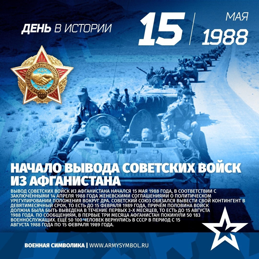 Вывод советских войск из Афганистана начался 15 мая 1988, в соответствии с заключёнными 14 апреля 1988 года Женевскими соглашениями о политическом урегулировании положения вокруг ДРА. Советский Союз обязался вывести свой контингент в девятимесячный срок, то есть до 15 февраля 1989 года, причём половина войск должна была быть выведена в течение первых 3-х месяцев, то есть до 15 августа 1988 года.