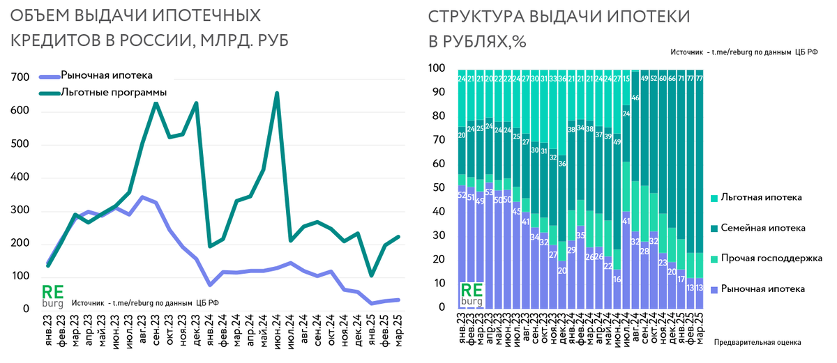ЦБ РФ рапортует о том, что средневзвешенный срок выданных в марте 2025 года ипотечных кредитов составил 311 месяцев. Это больше предыдущего рекорда, установленного в июне 2024 г. Неужели покупатели готовы брать кредит на 26 лет под 27% годовых? Средний срок кредита остается на рекордных отметках как на рынке строящегося жилья (под залог ДДУ), так и на рынке готового жилья. Вот только раньше ипотека в сегменте готовых квартир всегда ассоциировалась со вторичным рынком и рыночными ставками. Сейчас все изменилось. Заградительные ставки по рыночной ипотеке изменили ситуацию. Теперь ипотека в этом сегменте также формируется готовыми новостройками от застройщика. Дома сдаются в эксплуатацию, а значительная часть квартир не продана (статистика) и девелопер продолжает продавать их по льготной ипотеке. Сейчас ипотечный рынок держится в первую очередь на заемщиках, кому доступны льготные кредиты. И именно они растягивают сроки кредитования. Доля рыночной ипотеки в структуре выдачи упала до 13%.