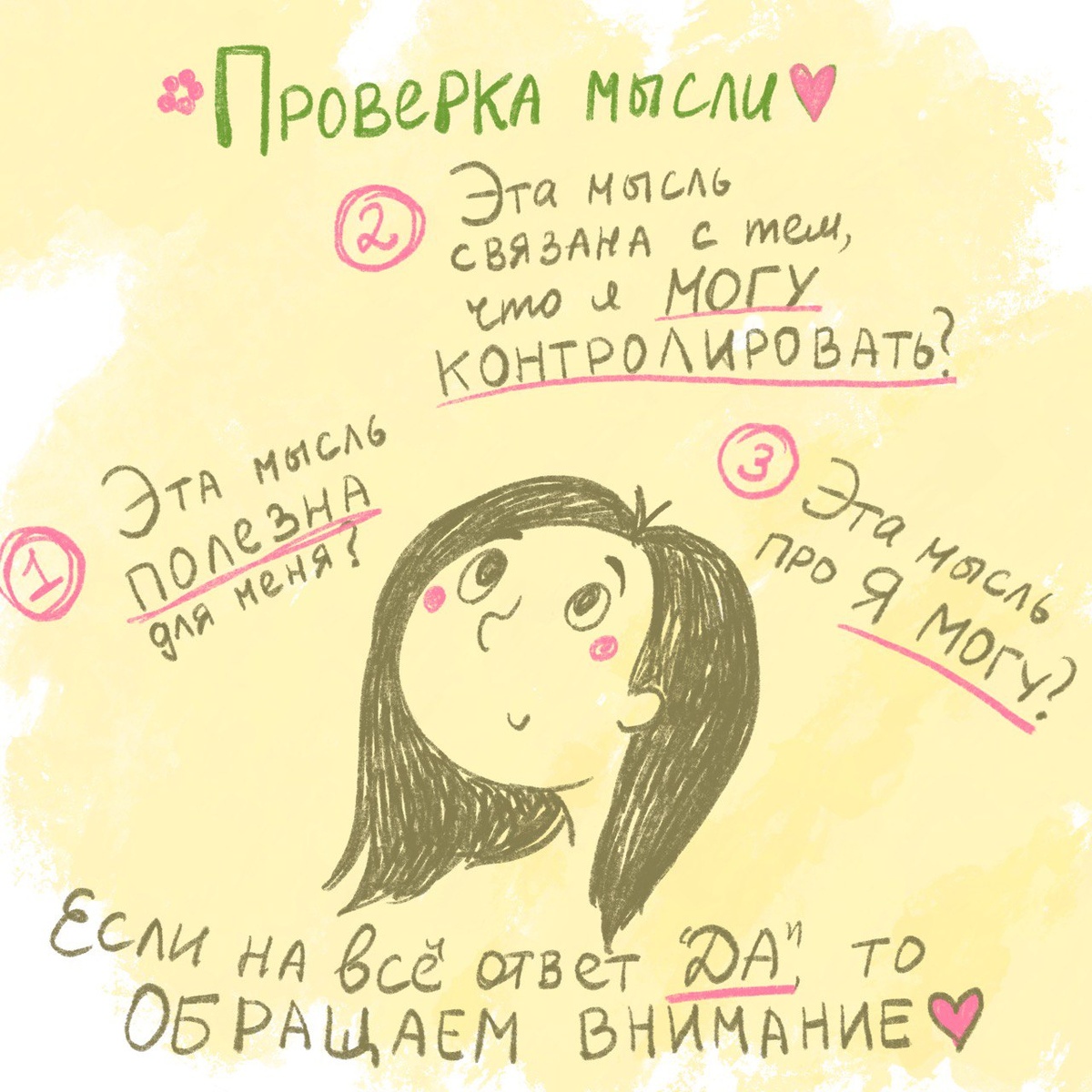 Чтобы «разделиться» и вернуться к полноценной жизни, важно научиться отделяться от мысли и задавать себе проверочные вопросы. Вот три из них, которые могут помочь. Спросите себя: Ситуация: вы не справились с задачей на работе. НЕполезные мысли: Полезные мысли: Полезные мысли поддерживают вас в росте и помогают двигаться дальше, а не застревать. Мы часто тратим огромное количество энергии на то, что не в нашей власти. Это изматывает и ведёт к тревоге. Спросите себя: Мысли вне зоны контроля: Мысли в зоне контроля: Иногда мысли крутятся вокруг желаний и сожалений: Эти формулировки создают ощущение беспомощности, потому что фокуси