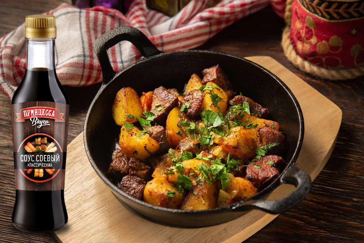 Хорошее второе блюдо с мясом и грибами. Подавать лучше в той посуде, что готовилось. Свинина без косточки: 0,5 кг Масло растительное: 4 ст. ложки Лук: 2 шт. Морковь: 1 шт. Картофель: 5-6 шт. Шампиньоны: 150-200 г Соль: по вкусу Перец черный молотый: по вкусу Базилик сухой: по вкусу Бульон: 150 мл Рубленая зелень: 1 ст. ложка Соевый соус: 1 ст. ложка Мед: 1 ст. ложка Коньяк: 1 ст. ложка Бальзамический уксус: 1 ст. ложка Мускатный орех: щепотка Режем мясо крупными кусочками. Его надо замариновать. Можете выбрать ваш любимый маринад. Мне нравится такой маринад (соевый соус, мед, коньяк, бальзамический уксус в равных пропорциях и немного мускатного ореха). Хорошо замариновать мясо на ночь на 8- 12 часов. Обжариваем мясо до румяности на 4 ст. ложках растительного масла. 2 луковицы порежем четьвертькольцами. 1 длинную морковь потрем на терке. Очистим 5-6 шт. картофеля и порежем его дольками как для фритюра, но тоньше. На дно противня выкладываем лук, потом морковь. Потом выложим слоем полови