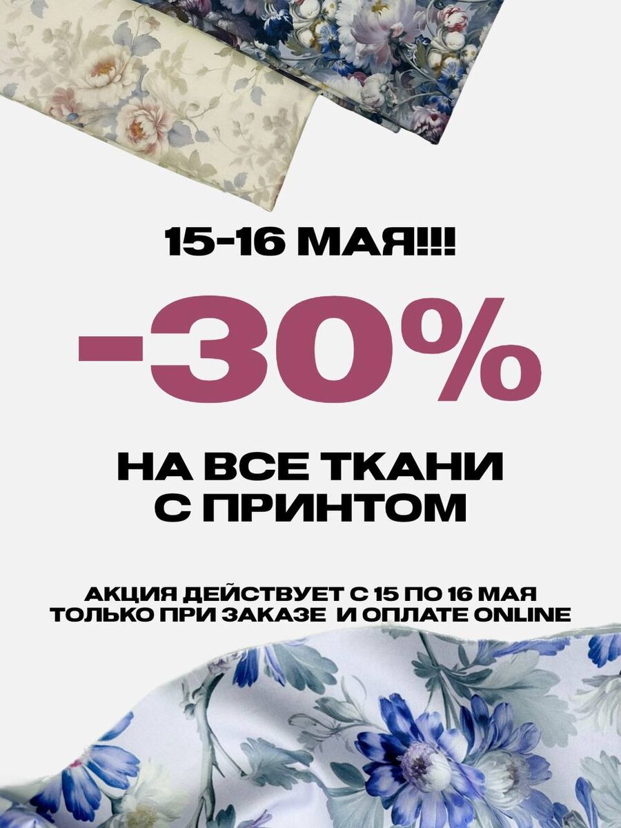 15 и 16 мая! ✨- 30% НА ВСЕ ТКАНИ с принтом! ➡️НА САЙТ⬅️ Условия акции: ◦ Скидка распространяется с 15 по 16 мая на все ткани с принтом ◦ Скидка действует только при заказе и оплате online ◦ Не суммируется с дисконтной картой ◦ Не суммируется с другими акциями и скидками