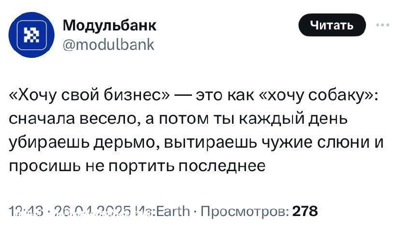 В Твиттере обнаружили, что между ведением собственного дела и уходом за собакой гораздо больше сходств, чем кажется на первый взгляд. Может, стоит отказаться от идеи самозанятости?