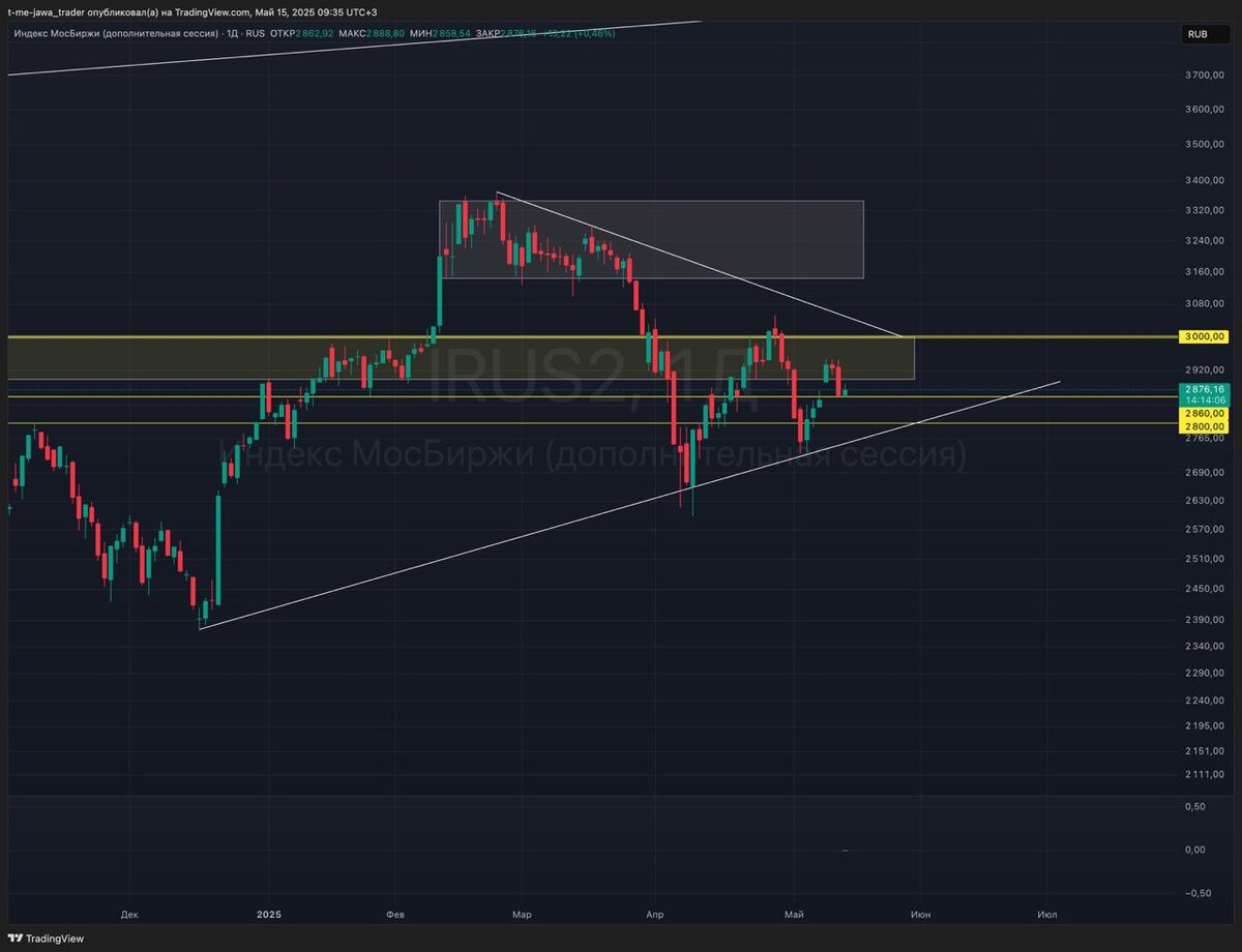 🗓 Четверг 15 мая 2025, ситуация на утро Вчера был выжидательный день, только к вечеру пошло движение вниз на новостях о составе делегации от РФ. Лично мне непонятен такой негатив, неужели кто-то рассчитывал, что поедет на переговоры сам Путин? В итоге, по Индексу Мосбиржи 🇷🇺 $IMOEXF $MXM5 $MMM5 четко отработали закрытие гэпа, сняли стопы лонгующих. После этого вполне вероятен поход выше, но сильно все зависит от новостей с переговоров. Скорее всего сегодня значимых новостей и движений не будет, жду движуху завтра. Наблюдаем. Всем профита! 👉 Подпишись на Jawa Trader