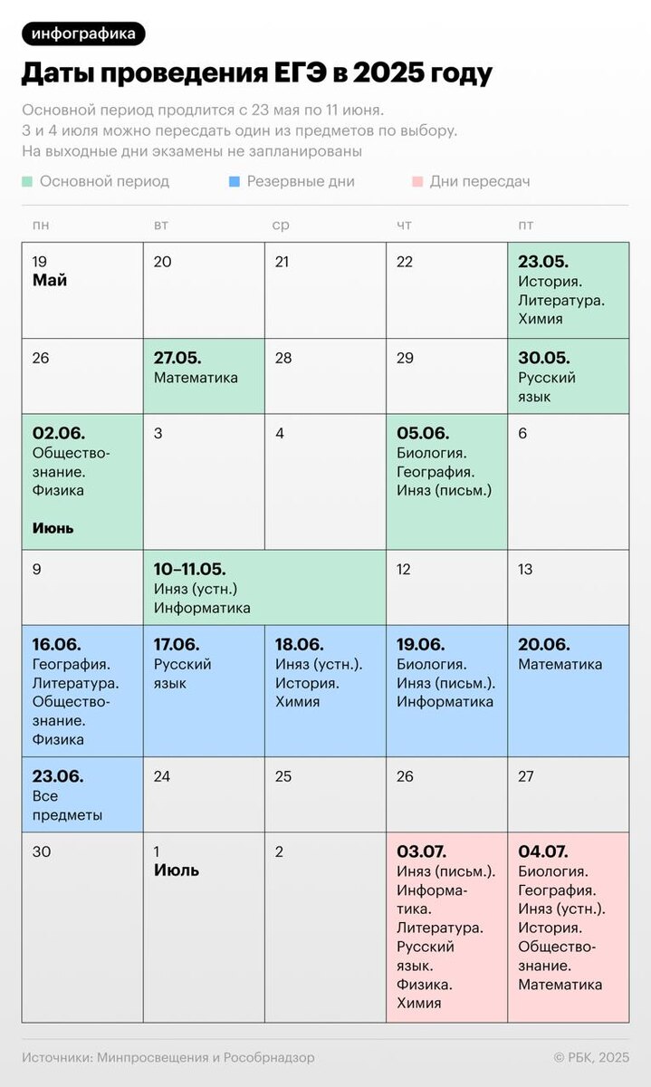 Расписание ЕГЭ в 2025 году. Календарь экзаменов и пересдач С 16 по 23 июня одиннадцатиклассники смогут пересдать экзамен, пропущенный по уважительной причине, или сдать ЕГЭ по одному из предметов, даты проведения которых в основной период выпали на один день. Тогда же ЕГЭ сдадут выпускники прошлых лет и школьники, не сдавшие обязательные предметы — русский язык и математику, без которых не выдают аттестат. На пересдачи выделены два дня — 3 и 4 июля. Выпускники смогут пересдать один предмет по выбору. Первый результат аннулируют, даже если он будет лучше. Инф. РБК