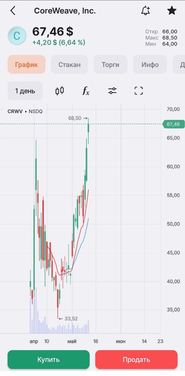 Уже вечером вчера отчитался за первый квартал CoreWeave. Это конкурент Nebius. Выручка +420% Ебитда +480% Показатели феноменальные! Акции на постмаркете прибавляют 10%, Небиус тоже рад +5%. (На момент написания) При этом CoreWeave в долгах, а Nebius нет. Ждём-с 20 мая отчет Небиуса. Хотелось бы там увидеть показатели не хуже! И тогда наконец-то перепишем исторический хай! Тьфу-тьфу-тьфу.